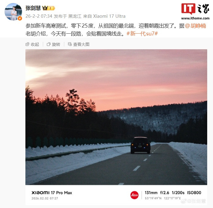IT之家注意到,小米集团副总裁、采购委员会主席、资产与工程管理部总经理张剑慧今日也在微博透露了新车进展,称参加新车高寒测试,今天有一段路,会贴着国境线走。其分享的图片展示了汽车动态情况,可以看到小蓝灯点亮上车。
